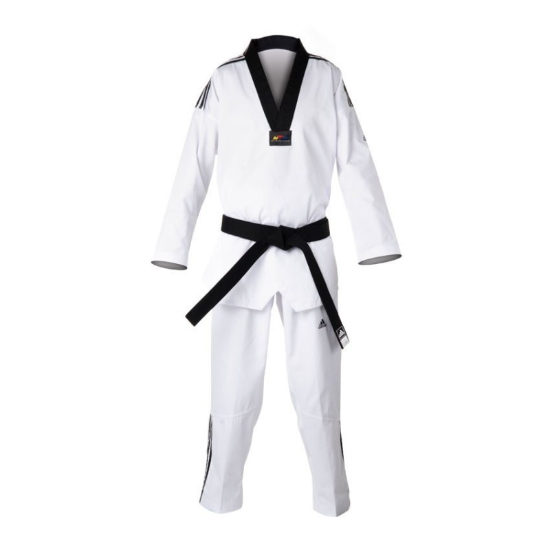 El Dobok Adidas es un traje compuesto por un pantalón y una chaqueta, y un Ti (cinturón que indica el grado del practicante), hechos de poliéster y algodón muy cómodo, para otorgar la mayor movilidad. Además es fácil de lavar en casa.