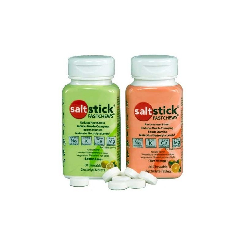 Las únicas tabletas masticables diseñadas especialmente para la recuperación del sodio, potasio, calcio y magnesio perdidos a través del sudor, son los electrolitos Saltstick Fastchews Tabletas. Sus componentes ayudan a reducir el estrés por calor y a recuperar los niveles de electrolitos mientras se absorben rápidamente al organismo. Los electrolitos Saltstick Fastchews no contienen grasas, colorantes artificiales, ni gluten, sólo los ingredientes que tu cuerpo necesita tras el ejercicio arduo.
